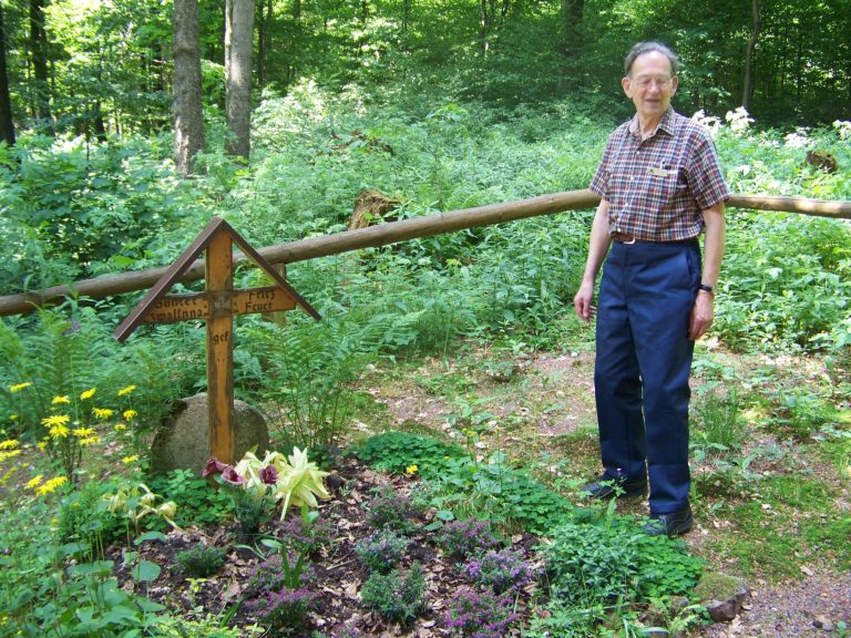 At a Monument in the Woods where two German youth were killed during the War. As the American Troops were approaching Suhl the German officers ordered the Hitler youth to report to the front. Two tried to avoid doing that and were executed on this spot by the SS