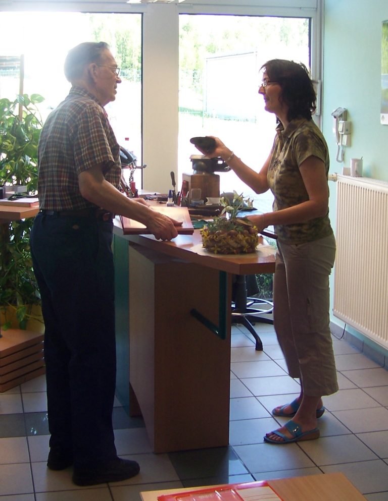 In the foyer of the Merkel Plant Dietrich discusses gun engraving with Silke Schmidt.
