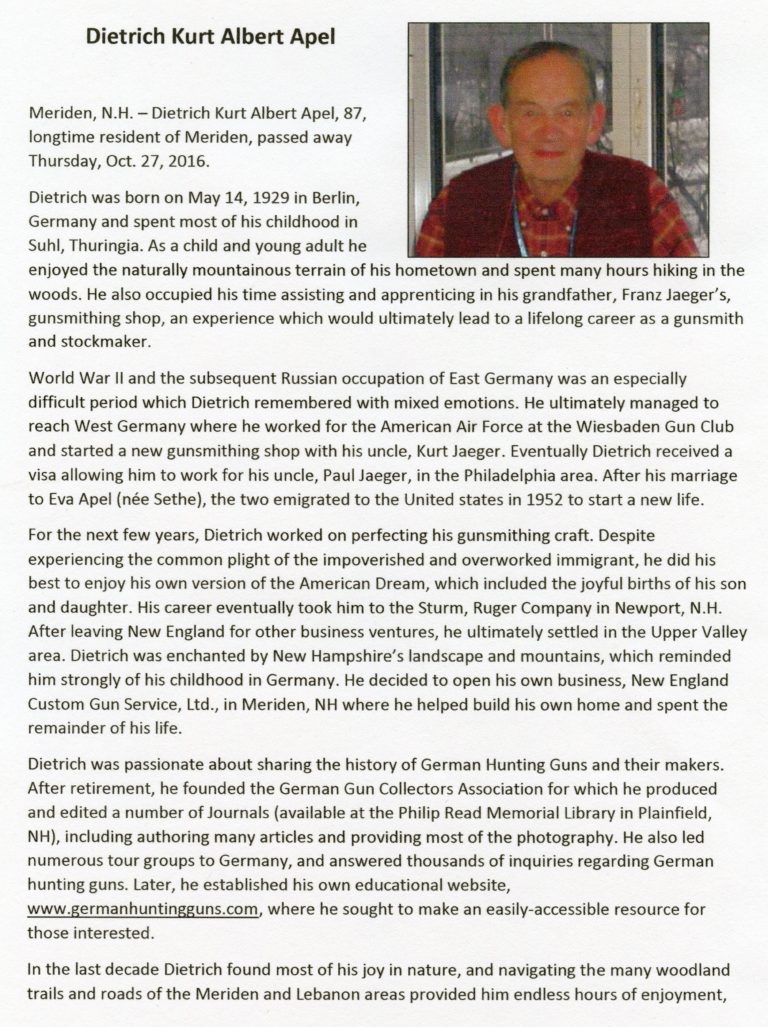 Dietrich had a life long passion for ensuring the sustained importance of German hunting weapons and their producers on the U. S. market. This eventually resulted in the foundation of the German Gun Collecting Association, which he promoted and guided with great enthusiasm. This way, he set himself a great monument that will continue to live on way past his lifetime. I am sure that true fans of noble and beautiful hunting weapons on both sides of the Atlantic will appreciate this for many more years to come.
