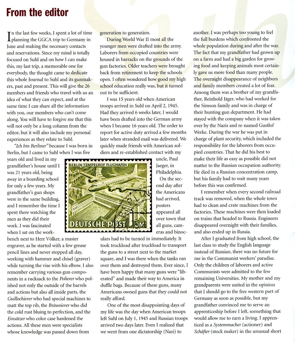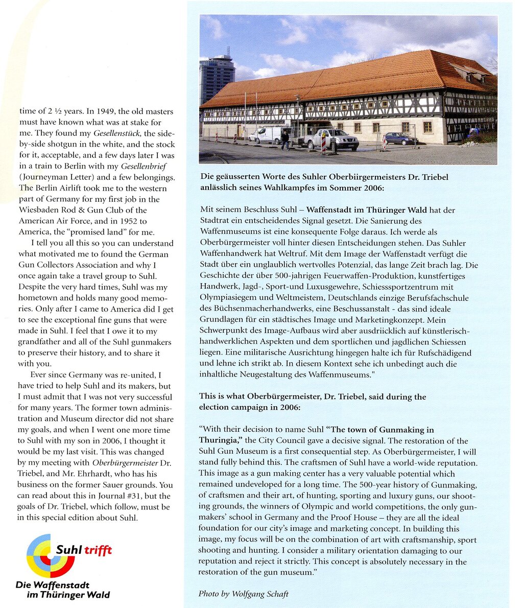 With his gracious permission the following is what Dietrich’s friend Jim Cate wrote:I’m Jim Cate, author of the SAUER books and a friend of Dietrich’s. I had already written two books about J.P.Sauer’s pistols and the Company history that went along with these pistols before I ever came in contact with Dietrich. After he found out that I had written two books about the pistols of the original Sauer Company in Suhl he asked me to be a founding member of the German Gun Collectors Association, and I did so. It was not long after that he discussed the idea with me of my writing another book about Sauer’s hunting and sporting guns made before the Russians took control of Suhl in July, 1945. I emphasized to him that the “Long” guns were not my forte, but he continued to encourage me to consider writing a new book about the hunting/sporting guns. I had very little documentation on the long guns and had not done any research regarding them during the numerous trips I made to Suhl. I was the first American to visit the Archive after the “Wall” came down. I was in Suhl in early Spring after the wall came down in November of 1989. All of the old Sauer facilities were still standing. After many consultations and learning sessions with Sauer collectors, and more trips to dig out Sauer information found in the Suhl Archive, I began the process of ‘making the book.’ During the entire process Dietrich continued to encourage me to include as much information and excellent photos as possible. I relied on many GGCA members for excellent photos, serial numbers, descriptions, historical data, etc.. Eight years ago, after more than six years in the ‘making’ , I had the new Sauer book published and I began selling them to members and non-members in many differant countries. About 50% of the new books were sold directly to individuals, with the remaining being sold to the GGCA and book dealers here and in Europe. I received several excellent book reviews and lots of compliments, but I truly believe Dietrich was just as happy as I was that the book was a success. He visited our home here in Chattanooga before the book was completed. He was a very determined person who created the GGCA and had strong feelings about it’s success. So much so that he (I was told later) upset several members who wanted to change numerous aspects of the organization supposedly to make it better. I stayed away from being a board member, although Dietrich wanted me to be one, in order that I could concentrate on completing the new book. He continued to forward many inquiries to me even after he left the GGCA so I could answer questions about Sauer guns. I will always consider him a good friend and a trusted adviser.