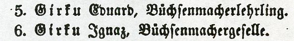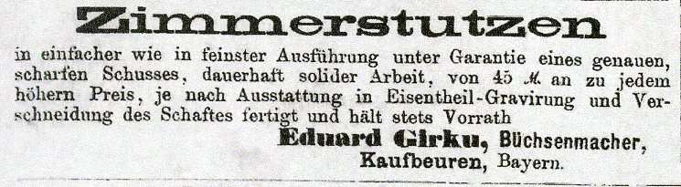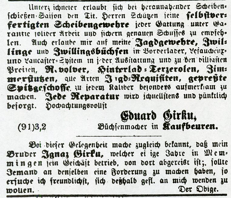 The pape and Kellner archive states that the Girku Gun Making firm was founded by Heinrich Girku. Most references cite Eduard Girku as the gun maker but perhaps His father who may have been Heinrich was also a gun maker. The Fahresbericht über die Landwirthschasts=und Gewerbsschule zu Kaufbeuren of 1850 & 1851 lists Eduard Girku as a Büchsenmacherlehrling (Gun Makers Apprentice) and his brother Ignaz Girku as a Büchsenmachergeselle (Journeyman Gun Maker) which implies that Ignaz is the older of the two. Eduard went into business by himself in about 1855.