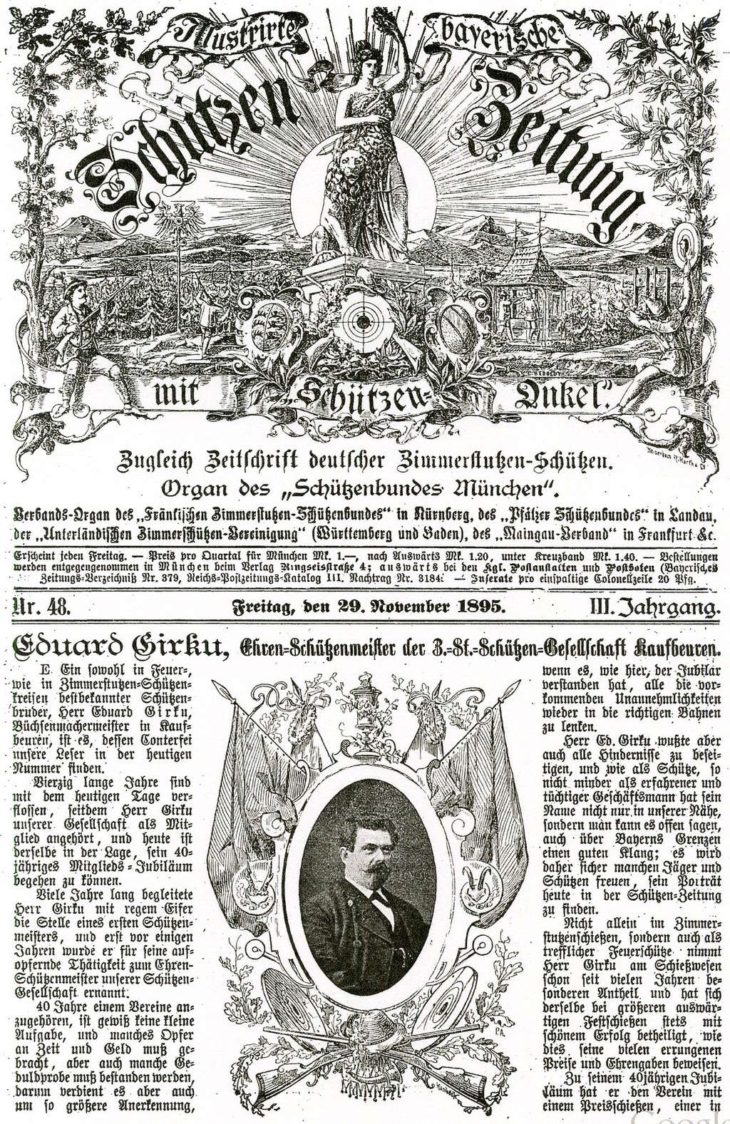 The Nov. 29, 1895 Illustrirte Bayerische Schützen Zeitung contains an article about Eduard Girku, the Ehren Schützenmeister of Kaufbeuren which includes his portrait.