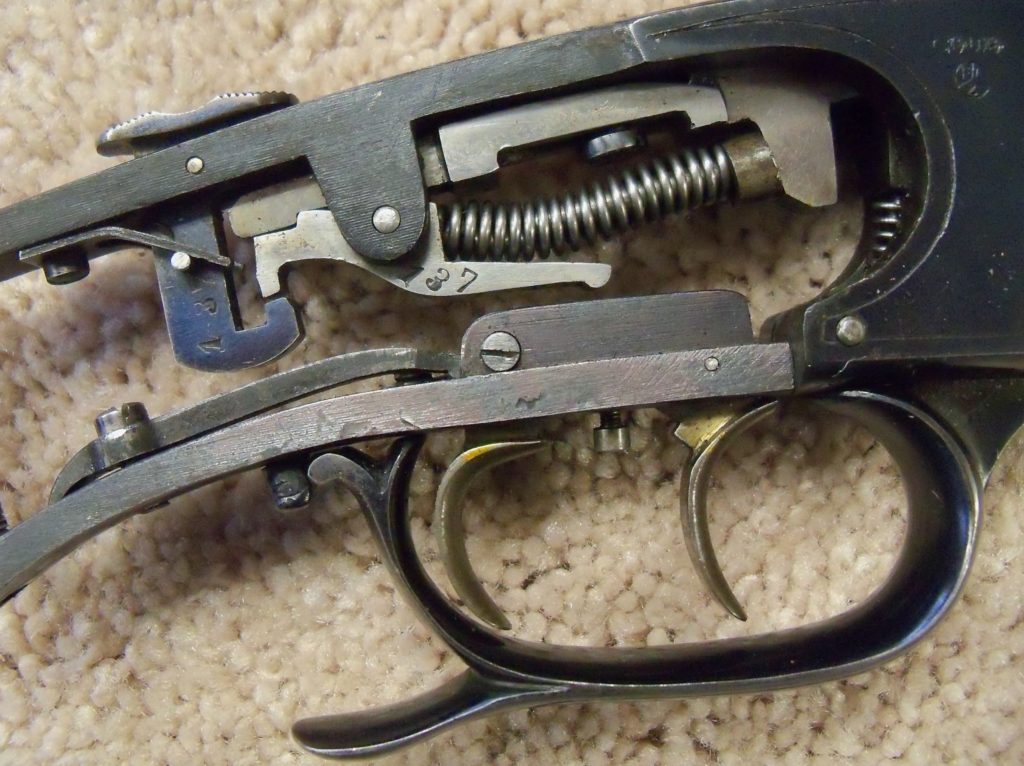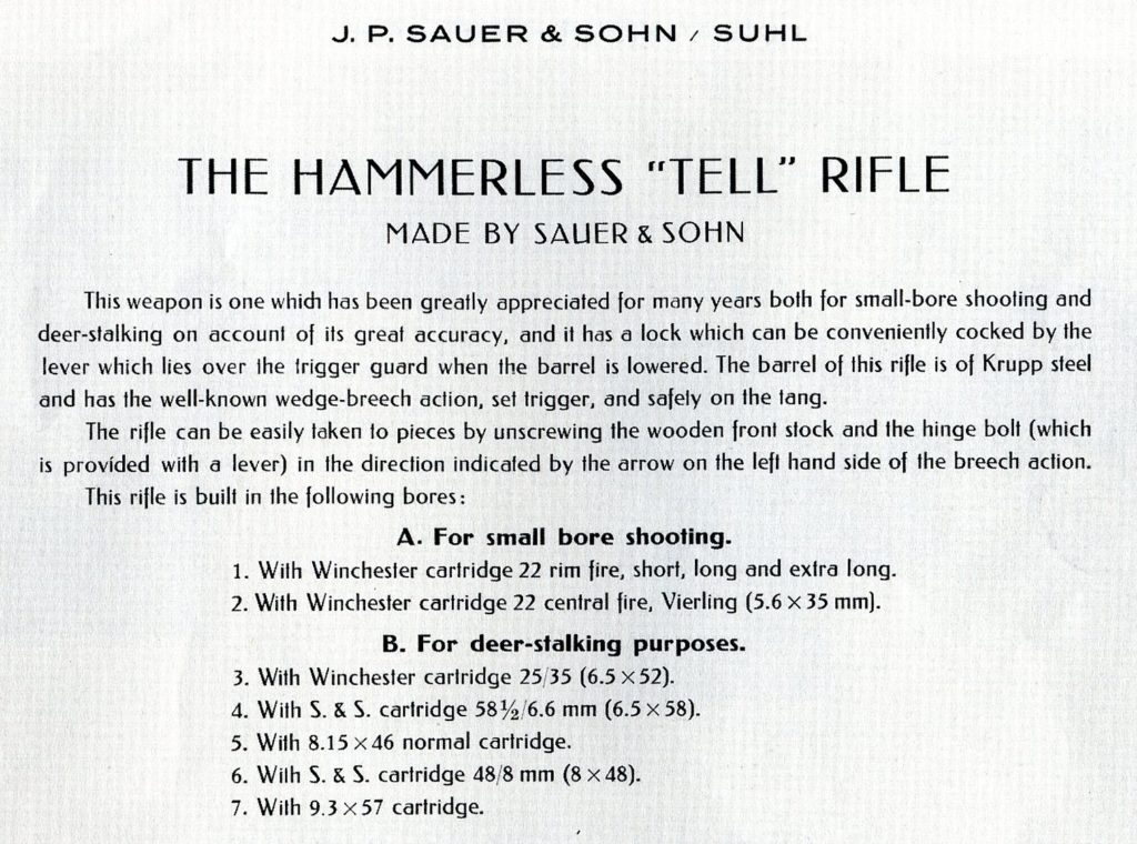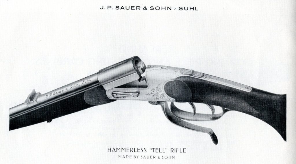 In their book J. P. Sauer & Sohn Peter Arfmann and Rolf Kallmeyer gives us the following information- “The ‘Tell’ model rifle with Sauer mechanism first appeared in 1896. It was a single shot, drop barrel, lever action rifle in which the lock was simultaneously cocked during operation.